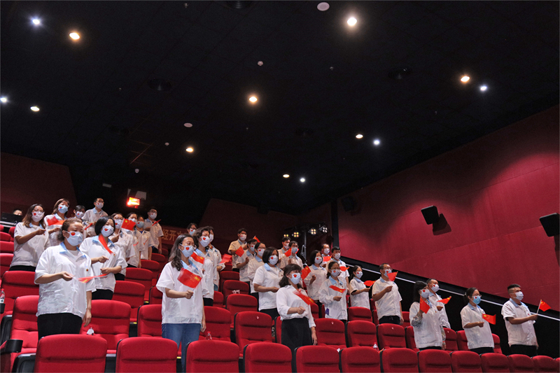 在電影開始前,所有參加活動的人員嚴肅起立,揮動手中的小紅旗,共同唱響國歌,向偉大的祖國、偉大的中國共產(chǎn)黨表達忠誠熱烈的愛。